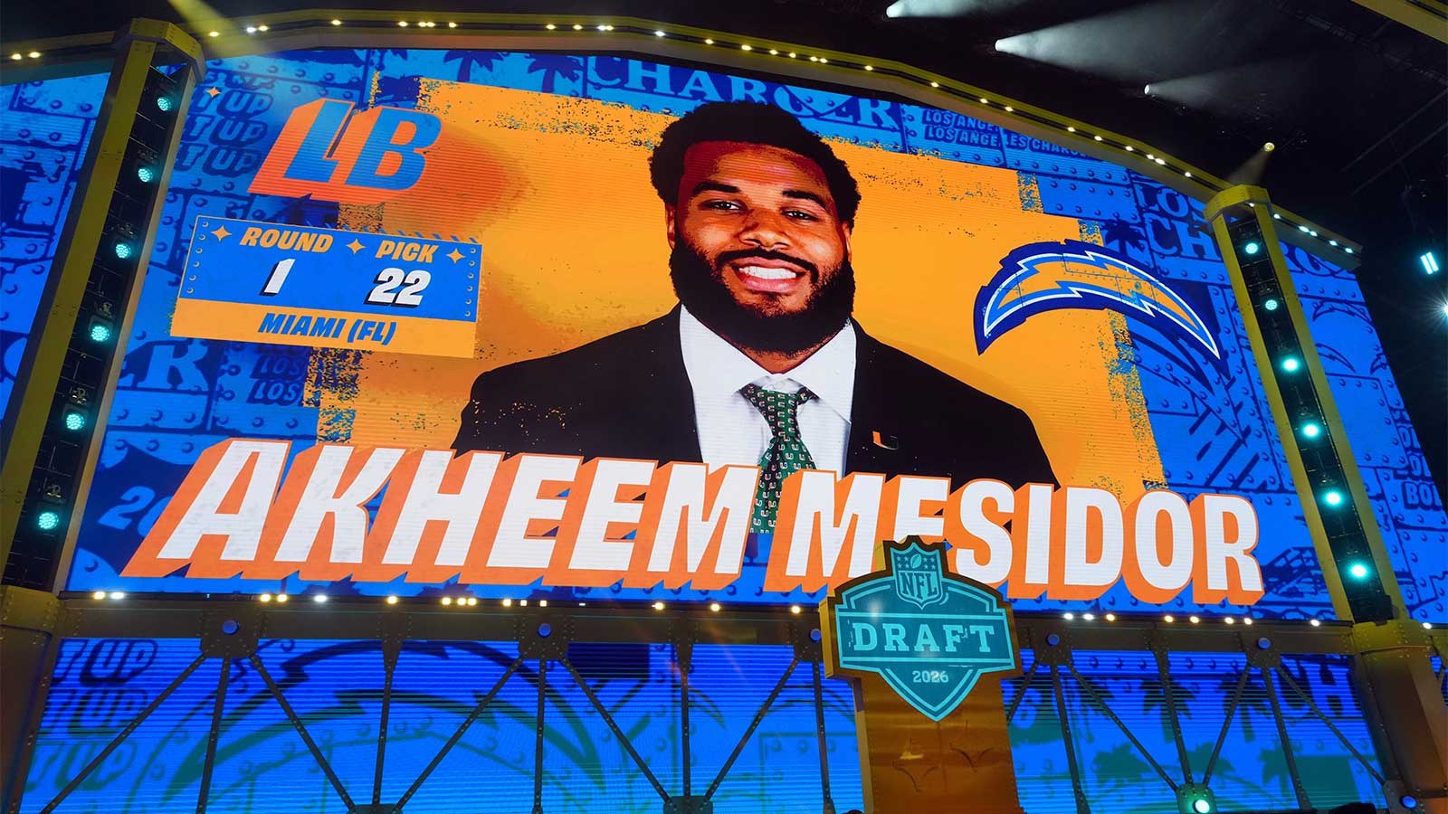 The Los Angeles Chargers selected Miami edge rusher Akheem Mesidor with the 22nd pick of the first round of the 2026 NFL Draft. This is a pick that makes a ton of sense for a Jim Harbaugh-led squad. Chargers general manager Joe Hortiz picked the best player available, according to ESPN rankings, and it is a position of need.