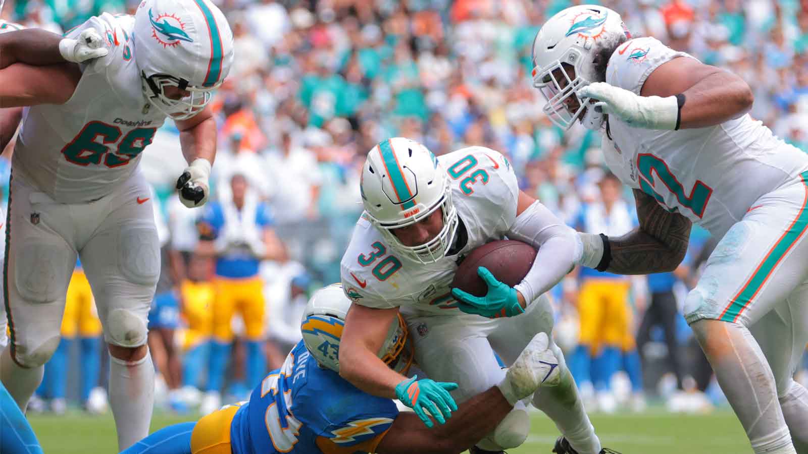 He punishes defenders without needing to have the football, though. He’s blocked for three different 1,000-yard rushers: Josh Jacobs with the Oakland Raiders (2019), then Dolphin teammates Raheem Mostert and DeVon Achane. Now Omarion Hampton has Ingold handling the dirty work for 2026.