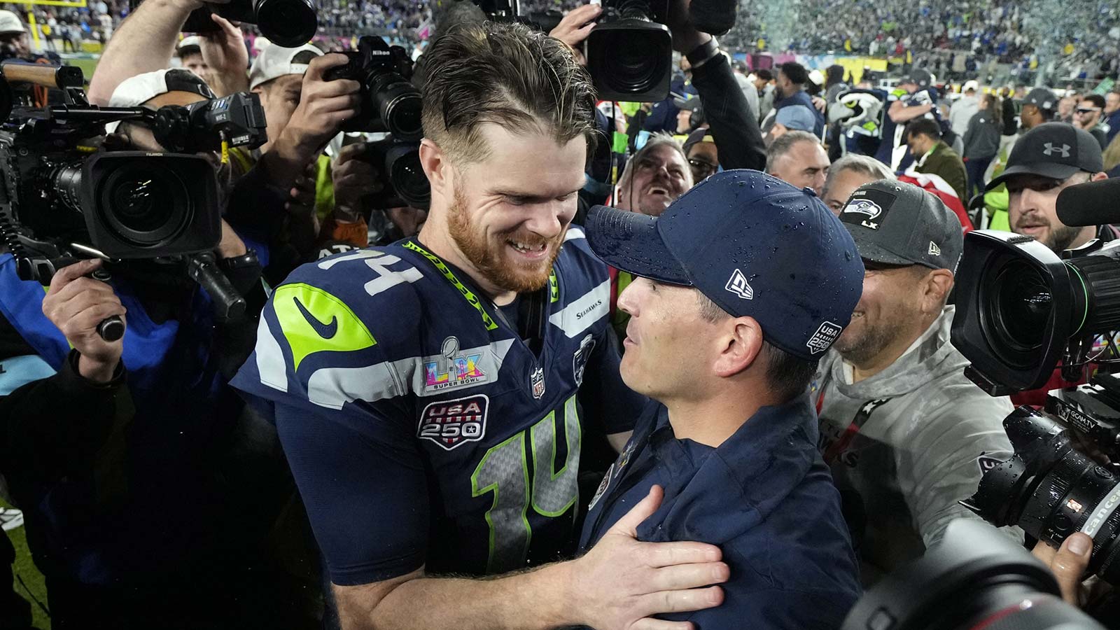 Seahawks QB Sam Darnold and head coach Mike Macdonald shared a wholesome moment shortly after winning Super Bowl 60.